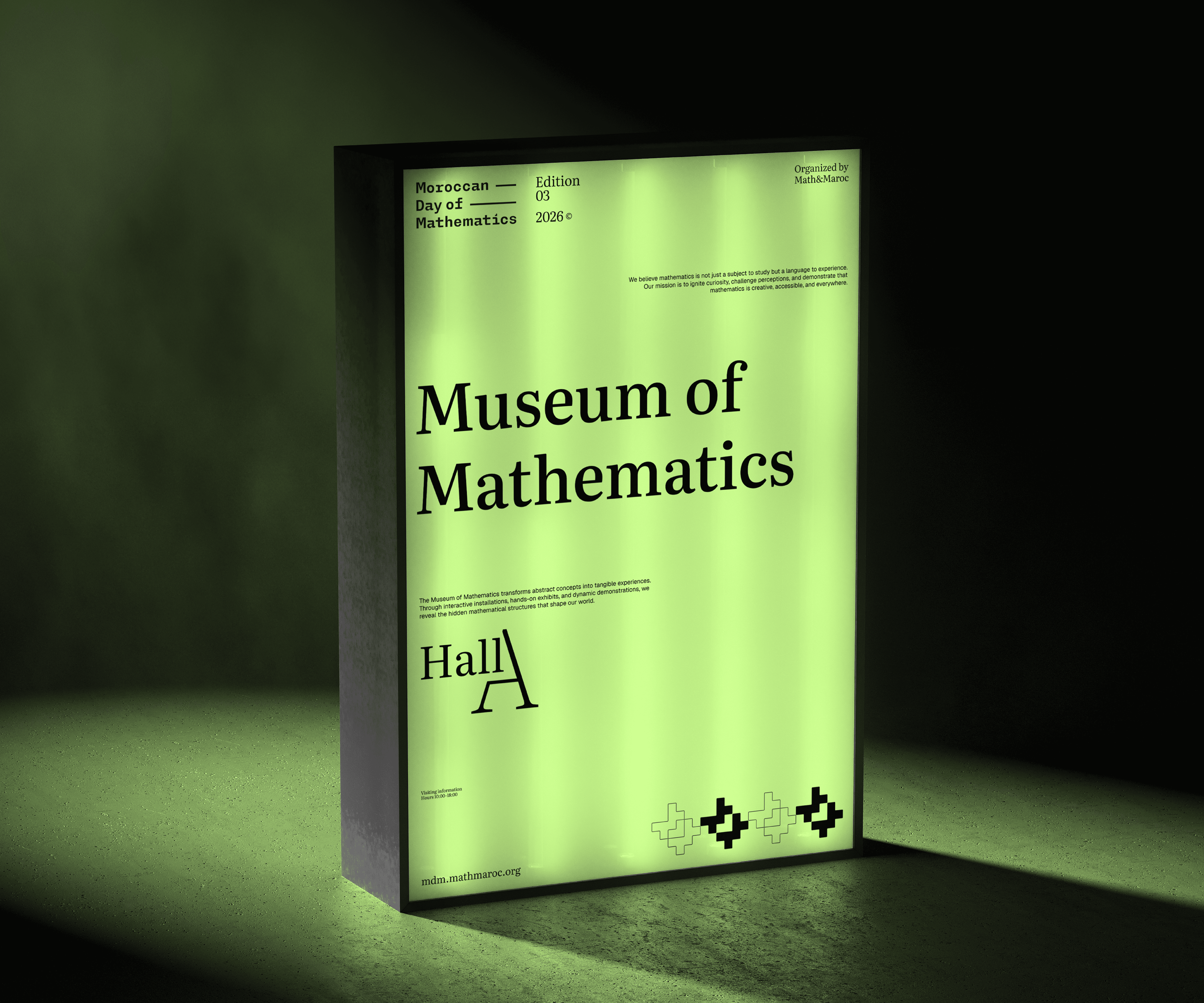 For the wordmark, I chose a monospaced typeface because it has that systematic, grid-like quality that mirrors how math works, everything precise and aligned. The horizontal lines next to "Moroccan" and "Day of" serve two purposes: they balance out the composition and create this sense of structure and organization, like mathematical notation or equations. The coolest detail is the dot on the "i" in "Mathematics", I made it match the exact shape of the "D" that appears in the negative space of the logomark. It's a subtle connection that ties the wordmark and logomark together, almost like a little easter egg for people who look closely.